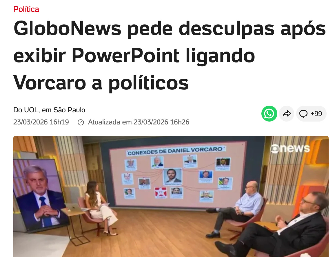 O Power Point da Globo não tem nada de errado. Assim como não tinha nada de errado o Power Point do Dallagnol. Foram apenas formas toscas para demonstrar que o petismo é uma coisa abominável. Assim como foi abominavelmente tosca a história dos arquivos do hacker de Araraquara para legalizar a corrupção no Brasil.