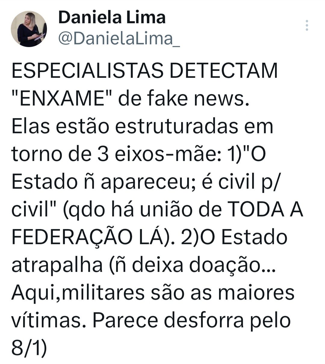 Daniela são sabe a diferença entre criticar o governo Lula por ser desorganizado e incompetente diante da tragédia em RS e a publicação de notícias falsas.