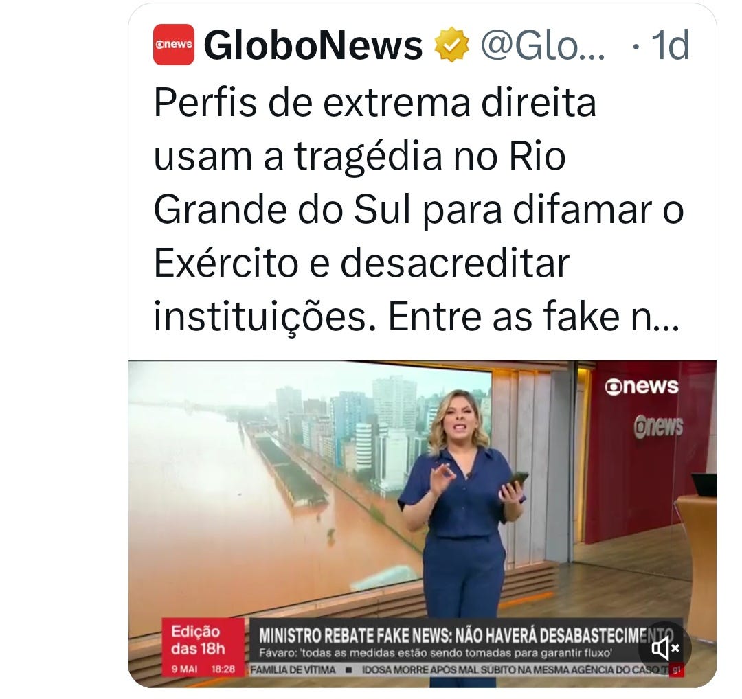 O canal que ela trabalha vive de barrigadas, que são “informações imprecisas”, segundo o glossário universal do jornalismo de WhatsApp”. Sua colega, Natuza, disse ao vivo que era fake news a ANTT ter autuado e multado os caminhoneiros que levavam ajuda humanitária aos gaúchos. No mesmo dia, o diretor-geral da ANTT se pronunciou confirmando as autuações e as multas. Nenhuma retratação. Nenhuma manifestação da nossa magistrada especial do jornalismo, Dani Lima.